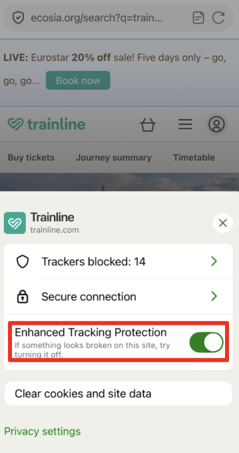 Ecosia pour iOS propose une protection améliorée contre le suivi, qui utilise une liste de Disconnect pour bloquer la publicité, les réseaux sociaux, les trackers d'analytics, les cryptomineurs et les fingerprinting. Cela réduit les publicités ciblées et empêche le suivi de la navigation. Les utilisateurs peuvent personnaliser la protection en la désactivant pour des sites spécifiques ou en choisissant entre les niveaux Standard ou Strict.