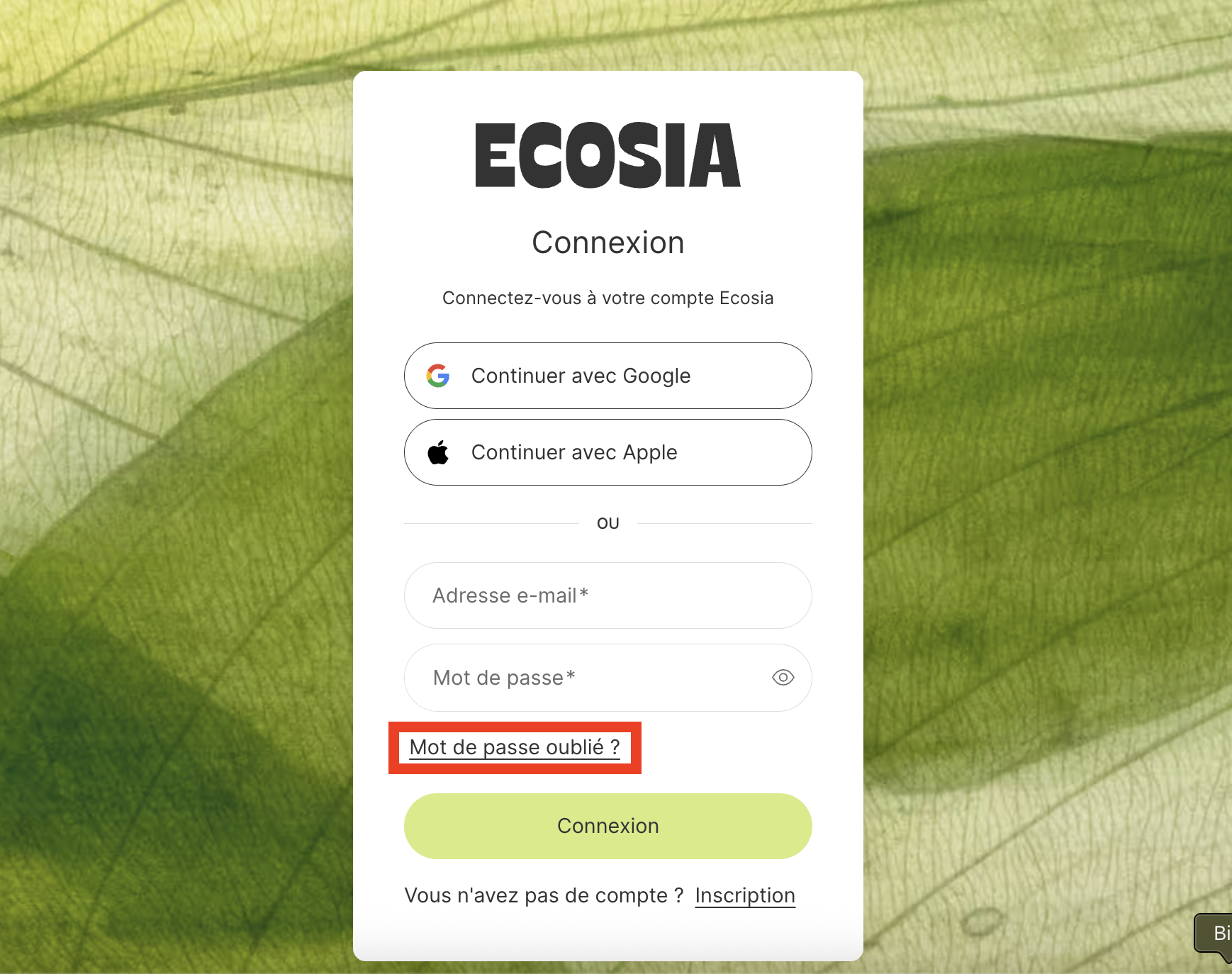 - Si vous avez initialement créé votre compte Ecosia avec Google ou Apple, utilisez toujours « Continuer avec Google / Apple ».