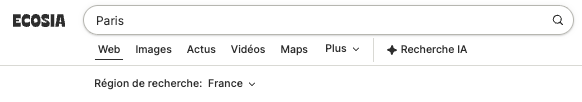 - Vérifiez ou changez votre région de recherche dans les paramètres d'Ecosia ou sous la barre de recherche après avoir effectué une recherche.