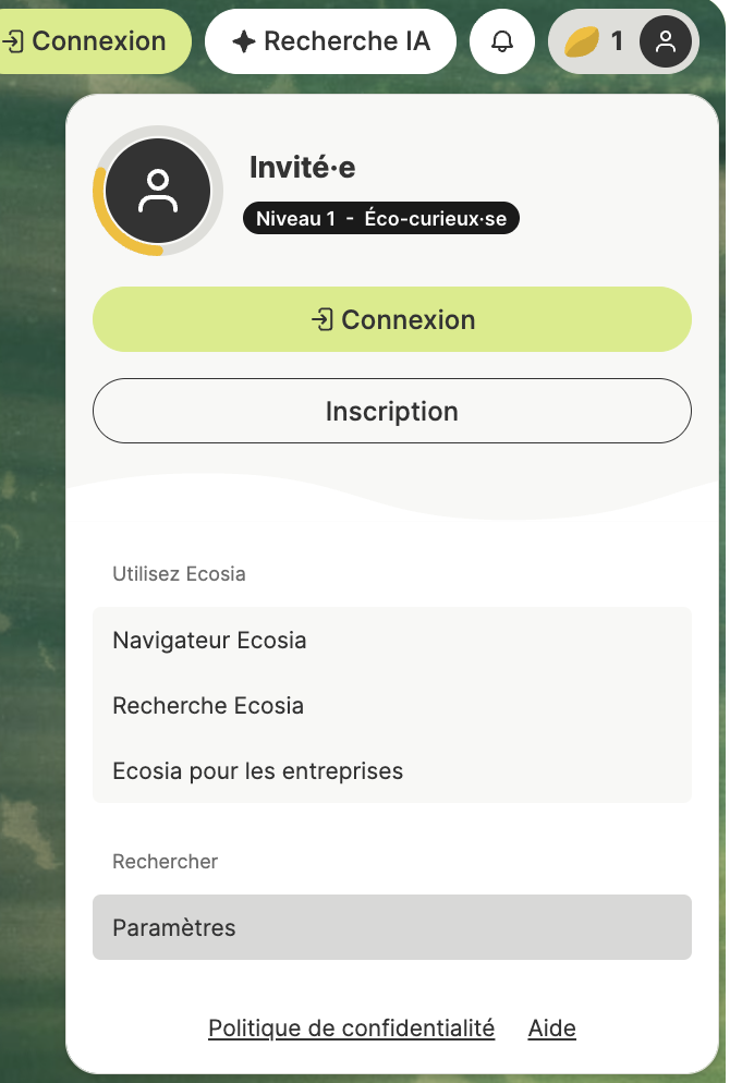 - Cliquez sur l'icône de profil en haut à droite de la page d'accueil d'Ecosia.