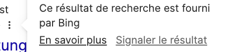 Veuillez garder à l'esprit qu'Ecosia peut toujours utiliser d'autres fournisseurs en raison de la disponibilité. Vous pouvez vérifier la source d'un résultat en cliquant sur les 3 points à côté du résultat.