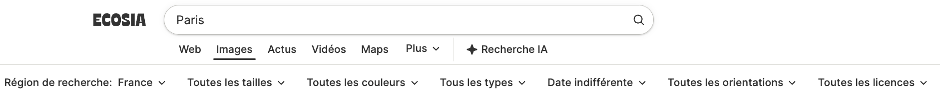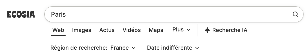 Le fournisseur de recherche sous-jacent (Bing, Google, EUSP) est choisi par Ecosia par marché, appareil et disponibilité. Si disponible, vous pouvez sélectionner un fournisseur de recherche préféré dans vos paramètres de recherche Ecosia.