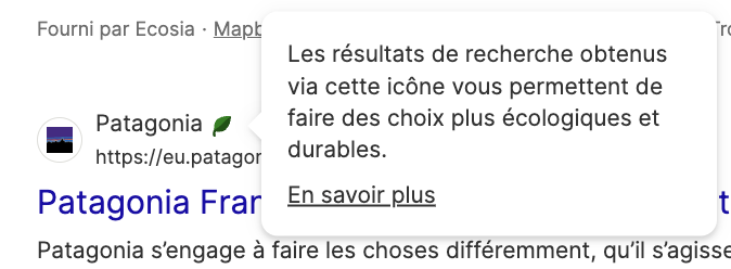 Ecosia ajoute également des fonctionnalités écologiques qui mettent en avant des options plus durables et vous aident à faire des choix respectueux du climat pendant vos recherches.