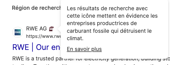 - Certains résultats de recherche affichent une petite icône de combustible fossile à côté du site web.